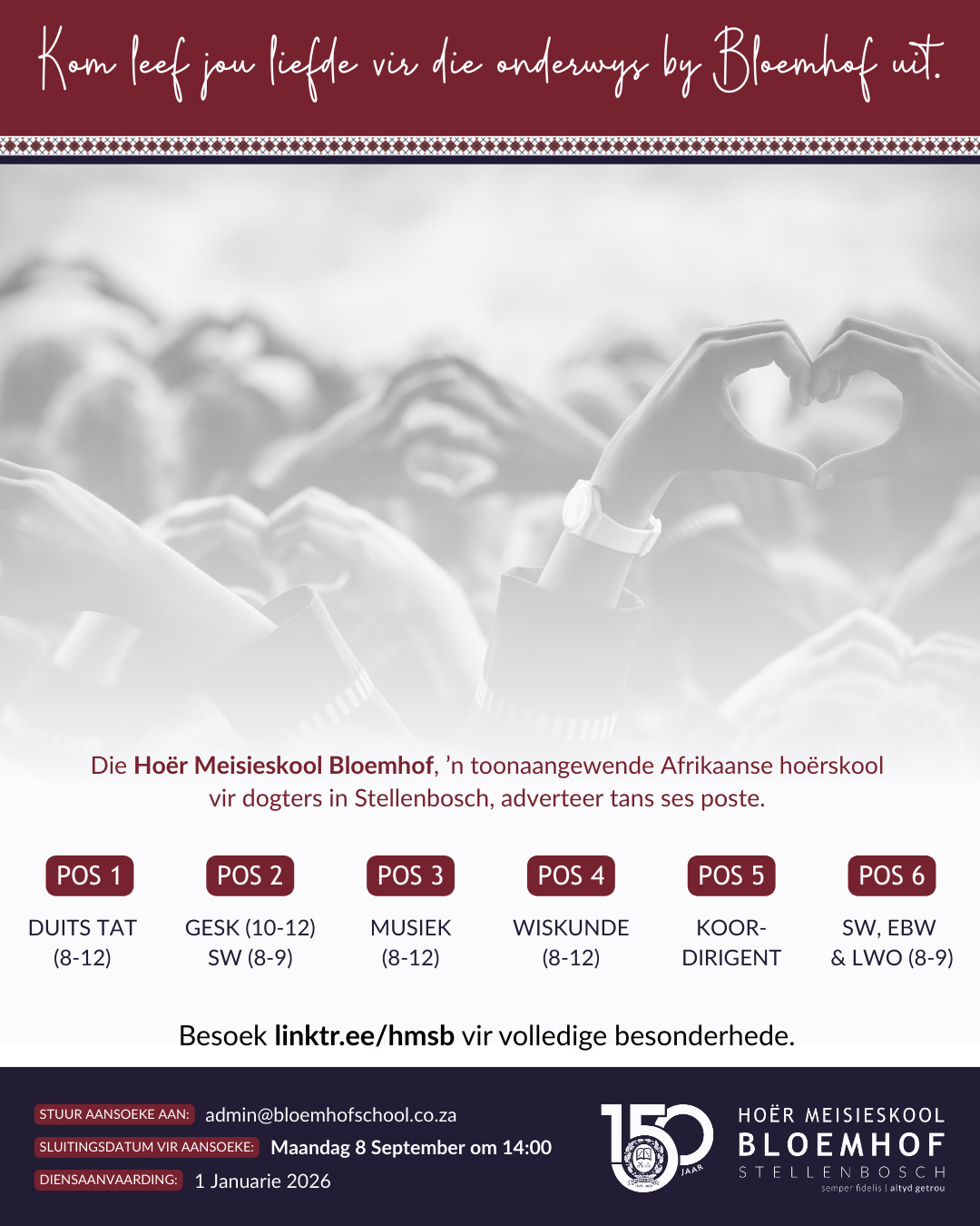 Bloemhof adverteer tans ses vakatures – help ons asb. om die regte kandidate te bereik deur ons advertensie op ons sosiale media te deel of om die onderstaande advertensie aan potensiale kandidate te stuur.