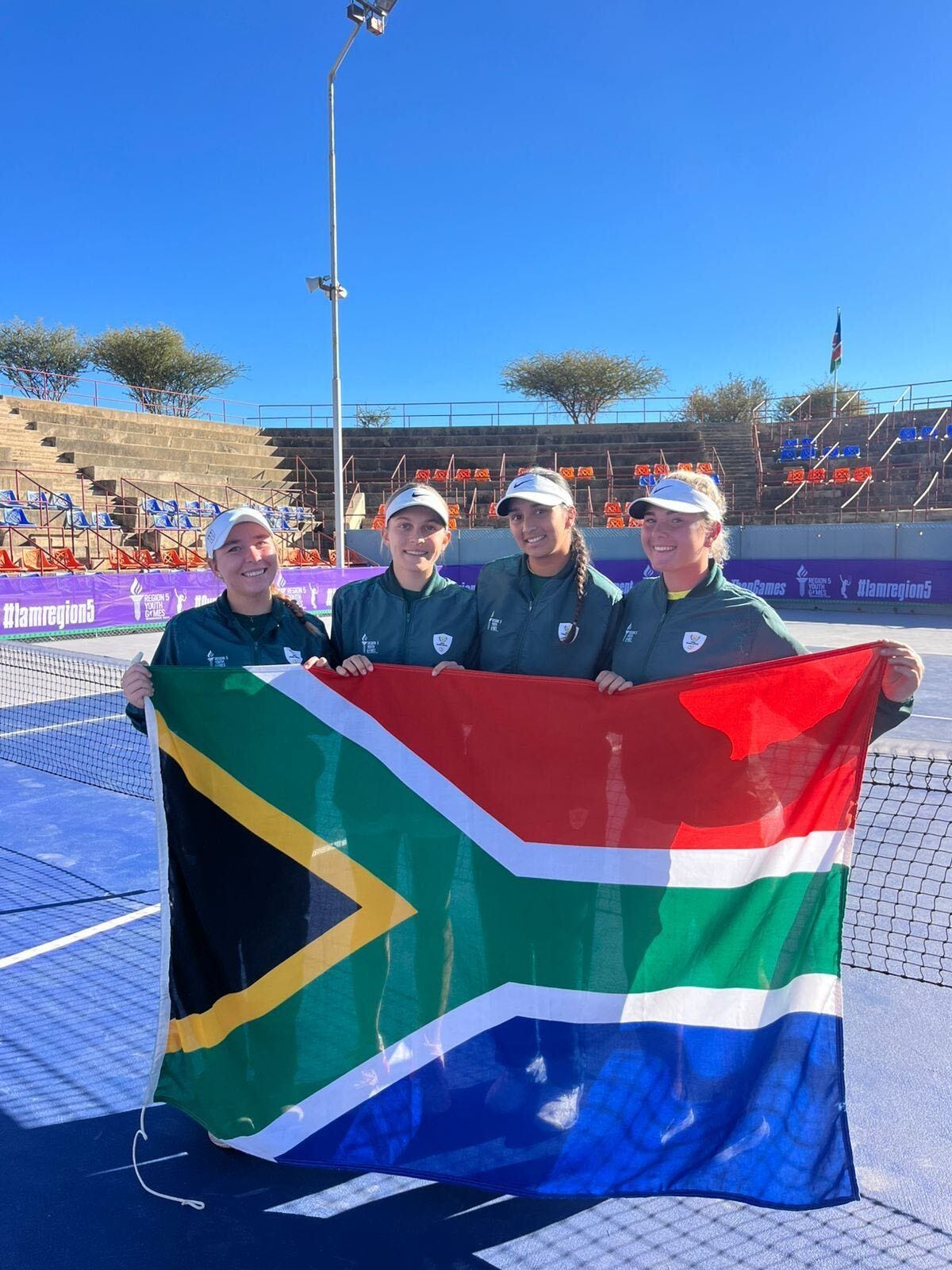 Daarna reis sy na Windhoek waar sy saam met drie ander jong vroue Suid-Afrika by die Region 5-Jeugspele verteenwoordig – Milla is heel links op die foto. Sy keer met drie medaljes terug: Goud vir spankompetisie, goud vir die gemengde dubbels en brons vir vrouedubbels. Dis ’n báié groot prestasie, Milla! Veels geluk!