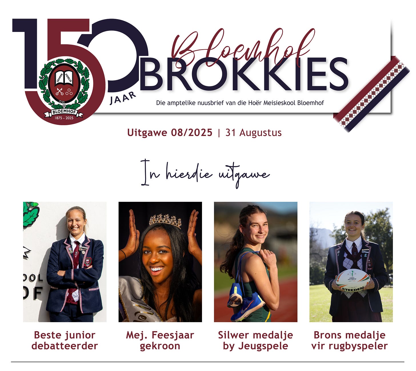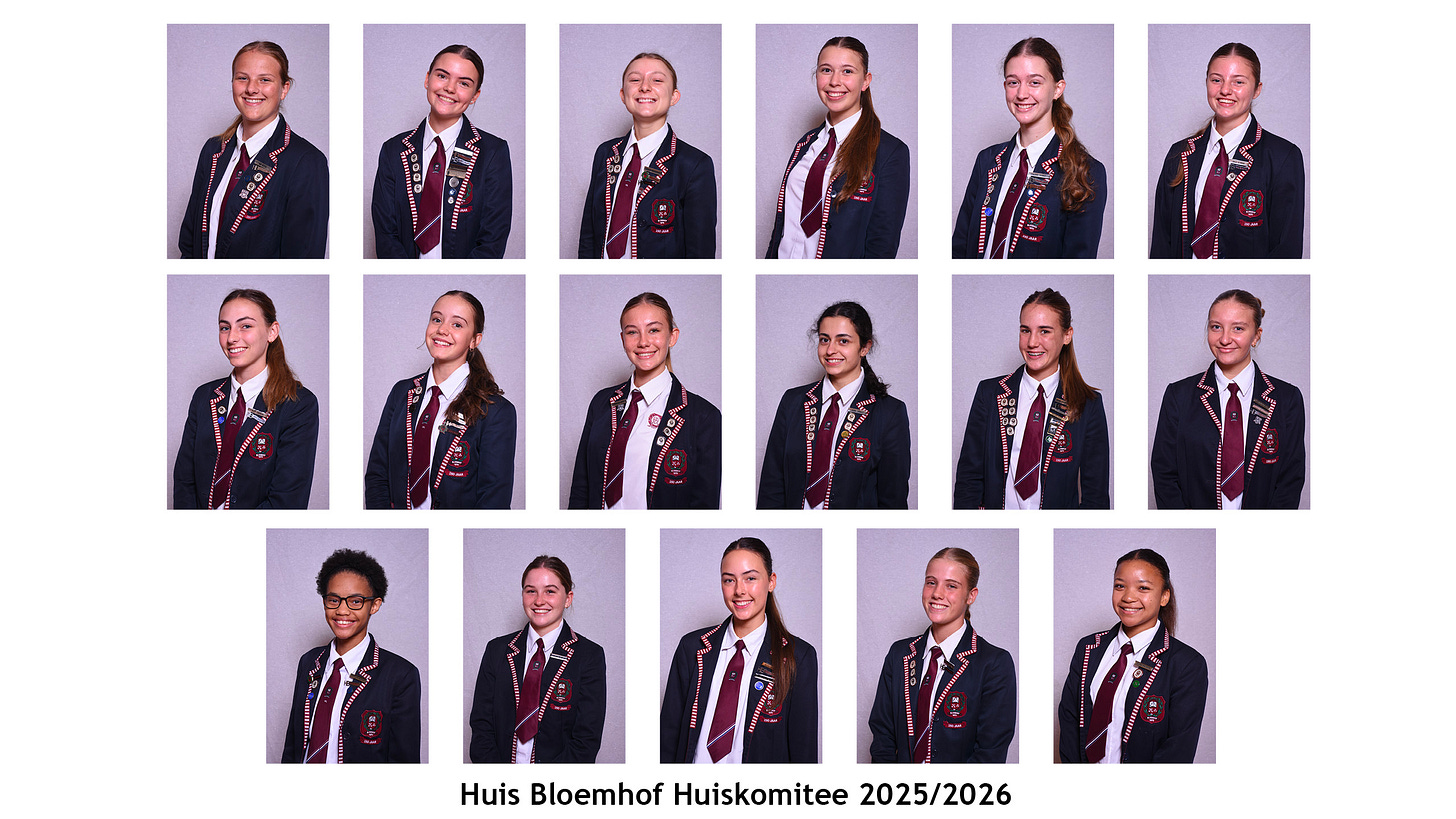 Die skool en koshuis se hoofleiers is op Maandag 25 Augustus tydens die leiers se inhuldigingseremonie aangekondig: Bloemhof se hoofdogter vir 2025/26 is Tachin Adams, met Chanika Arnolds wat as onder-hoofdogter verkies is. In Huis Bloemhof dra Janke Strauss die hoofdogterbalkie, terwyl Kaylie Herbst die onder-hoofdogter is. Ons deel in ons volgende uitgawe meer nuus oor ons nuwe hoofleiers.