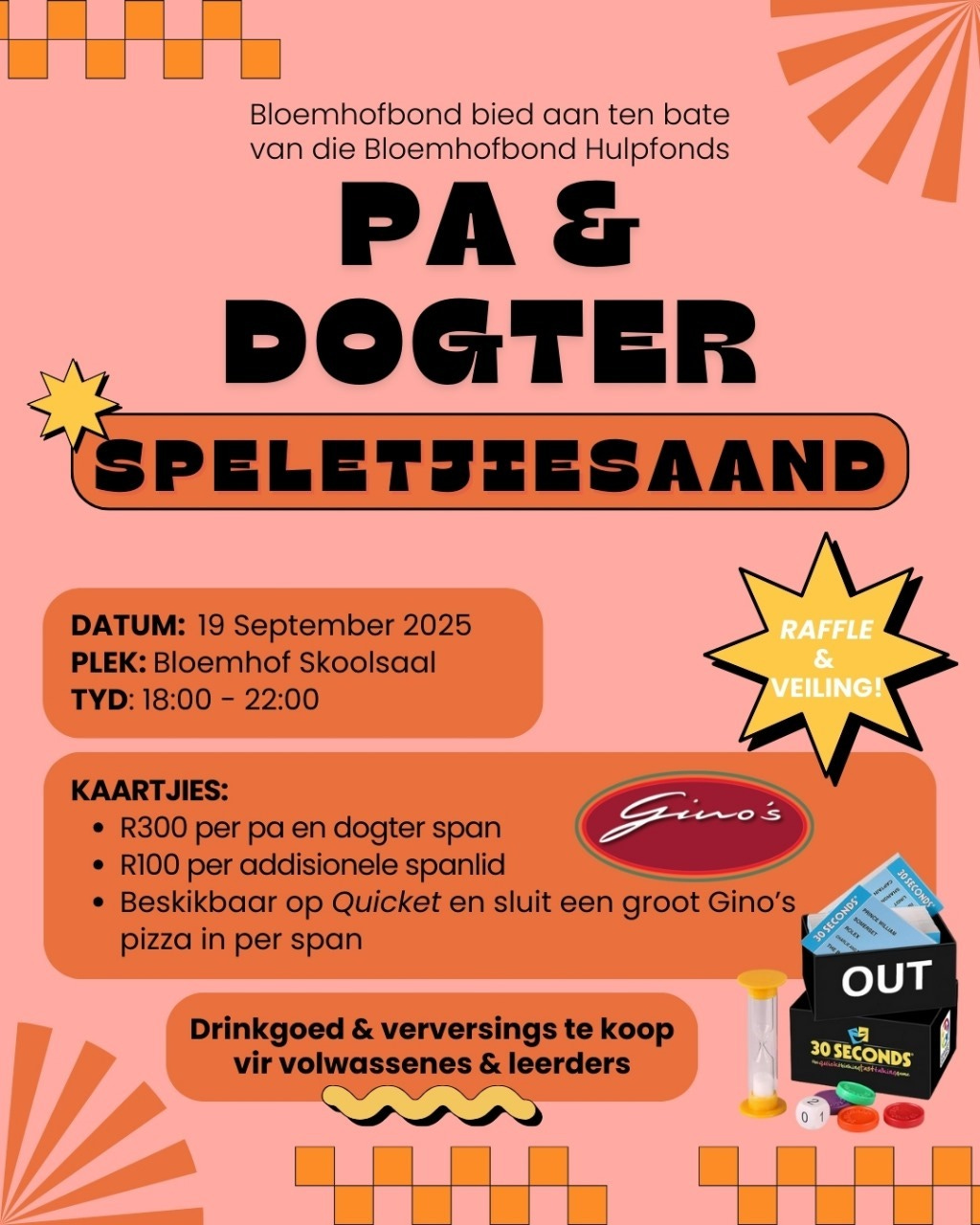 Die Bloemhofbond se jaarlikse pa-en-dogter-speletjiesaand is om die draai! Kaartjies is HIER via Quicket beskikbaar.